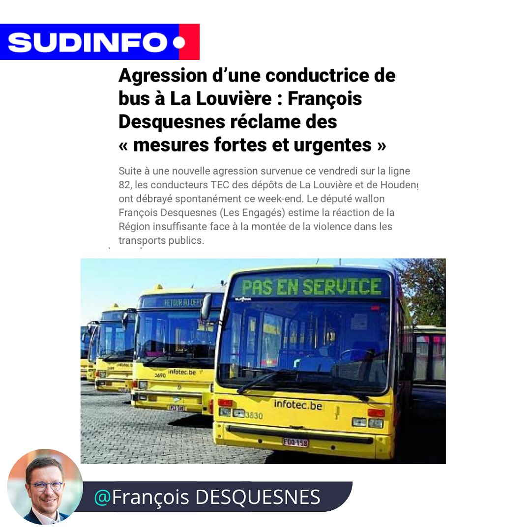 Ce 3 mai, une chauffeuse des TEC a été agressée par un individu sur la ligne 82 : injures et crachats!!Ces agressions et incivilités se produisent de plus en plus souvent ! Les campagnes de sensibilisation et les promesses de davantage de patrouilles sont visiblement inefficaces et les réactions des autorités régionales sont nettement insuffisantes...